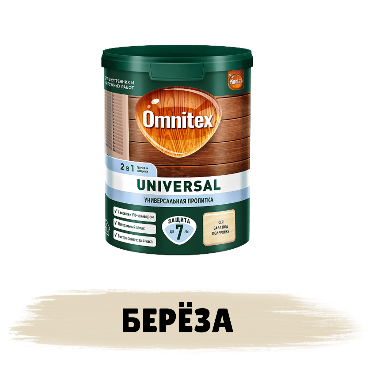 Пропитка для дерева Omnitex Universal используется как для наружных работ, так и безопасна для применения внутри помещений (универсальная), т.к. не содержит биоцидных добавок, не выделяет вредных веществ. Формула 2 в 1: наносится без грунта, питает и защищает от влаги и загрязнений, окрашенная поверхность устойчива к воздействию солнца, дождя, снега и мороза. Omnitex Universal легко наносится и быстро впитывается в поверхность древесины, образуя полуматовое покрытие. Подчеркивает естественную текстуру древесины.