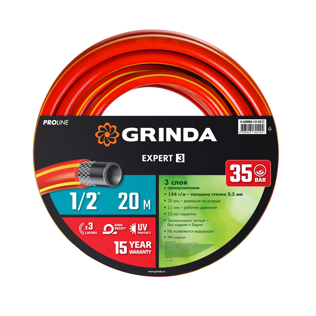 Шланг поливочный EXPERT 3, 1/2", 20 метров, 35 атм, трехслойный армированный, GRINDA