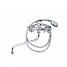 Двухвентильный смеситель для раковины выполнен из сплава цветных металлов. Форма излива крана - округлая, изогнутая.